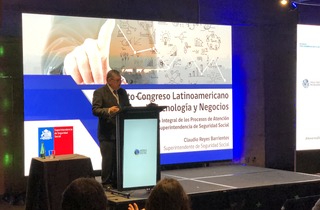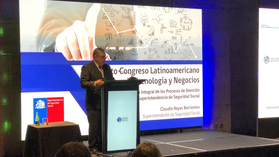 Santiago, miércoles 5 de septiembre. Ante más de 150 personas expuso el Superintendente de Seguridad Social, Claudio Reyes, en el marco del 4to Congreso Latinoamericano Tecnología y Negocios América digital realizado en espacio Riesco, el que contó con gran afluencia de público.
