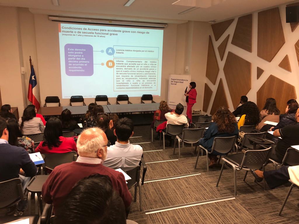 Ante casi medio centenar de personas que asistieron al Auditorio Clotario Blest del Ministerio del Trabajo, la Superintendencia de Seguridad Social (SUSESO) capacitó en materias vinculadas a la Ley Sanna (La ley Sanna es un Seguro para los padres y madres trabajadores de niños y niñas afectados por una condición grave de salud).