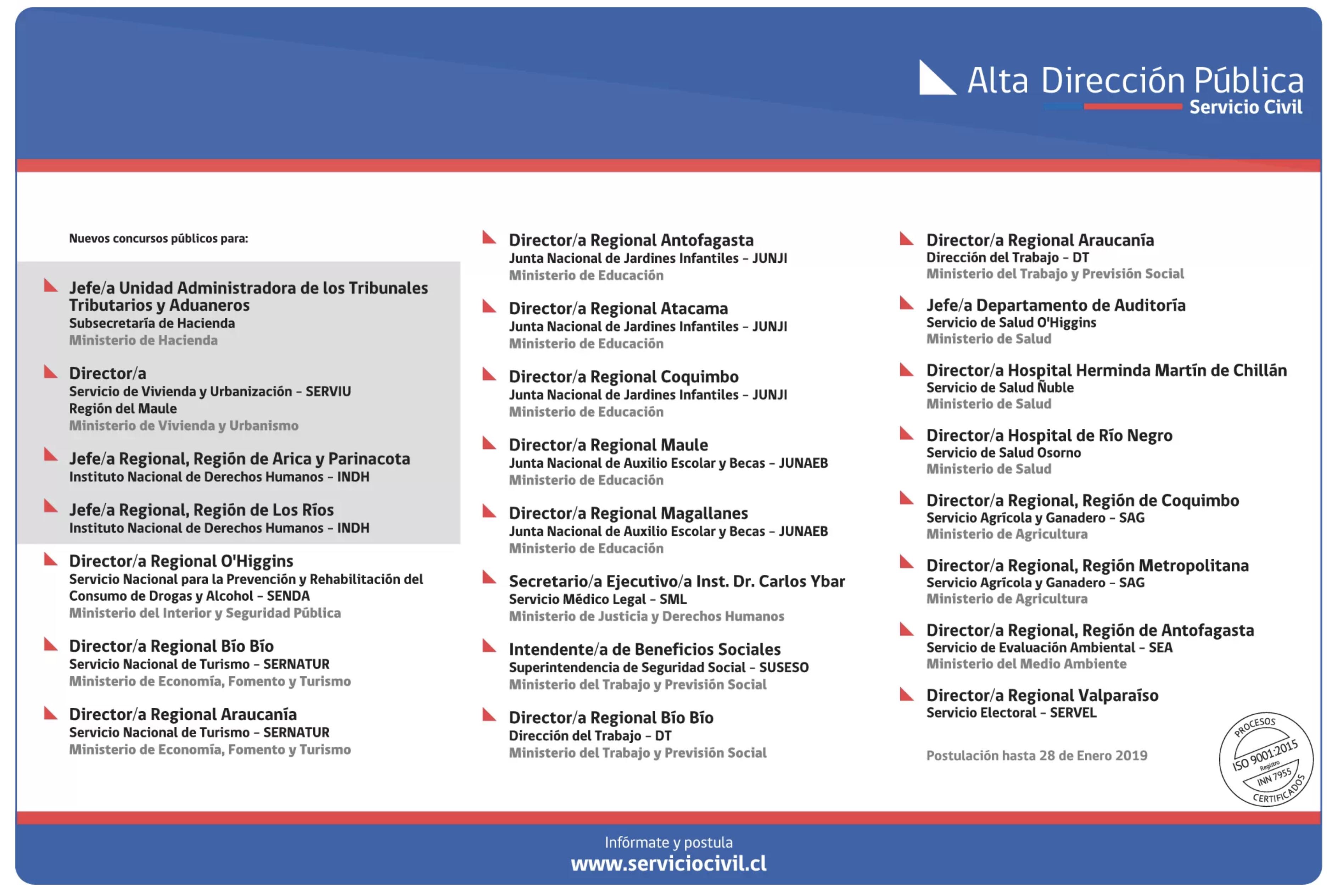El Sistema de Postulación para cargos de Alta Dirección Pública publicó el pasado sábado 16 de septiembre la convocatoria y reclutamiento para el cargo de Intendente/a de Beneficios Sociales de la Superintendencia de Seguridad Social (SUSESO), la que estará abierta a recibir postulaciones hasta el 28 de enero de 2019.
