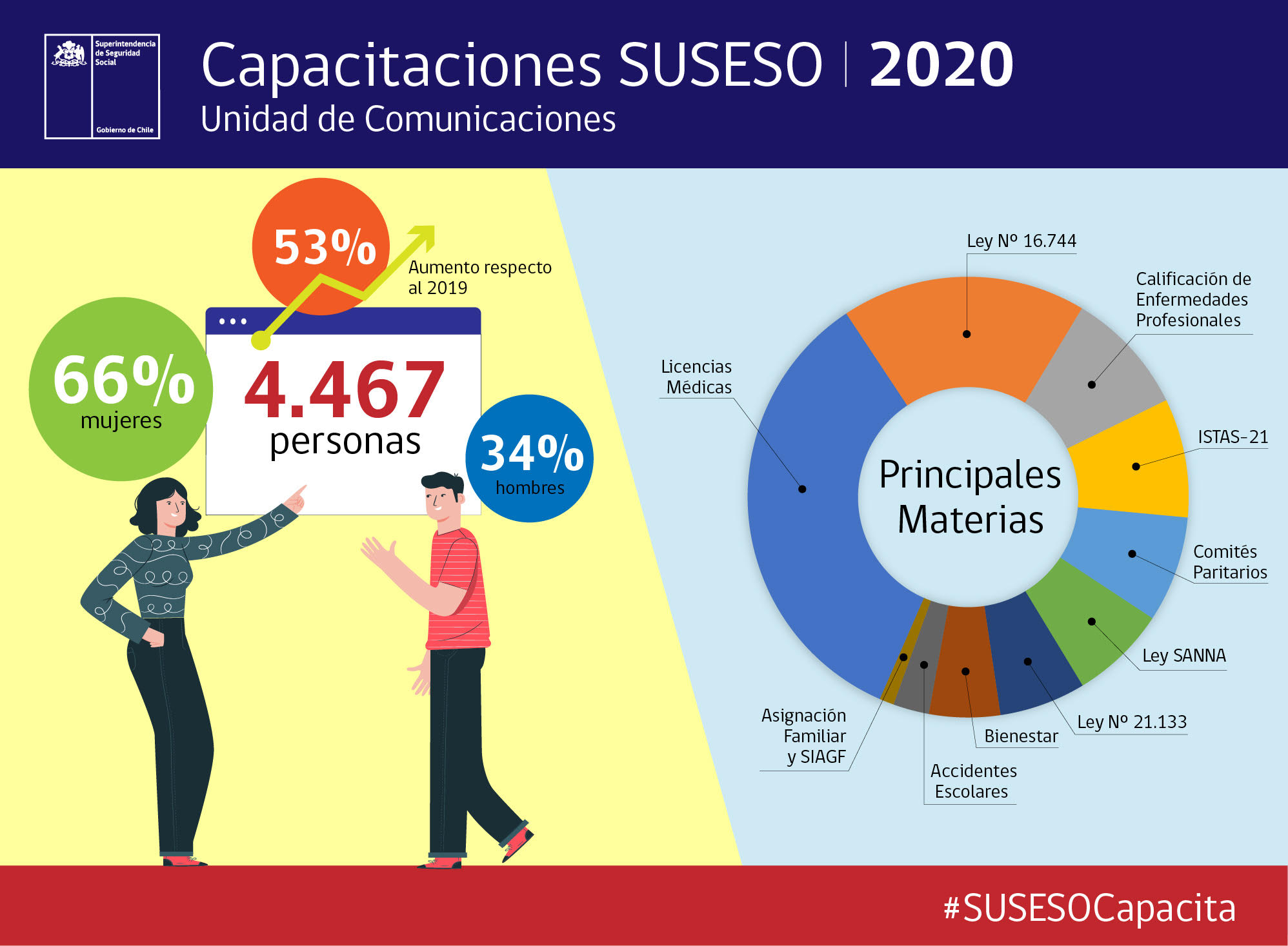 Santiago, 29 de enero. En el marco del Programa de Difusión y Capacitación de la Seguridad Social implementado por la Unidad de Comunicaciones de SUSESO presentó los resultados del año 2020, donde se capacitó a 4.467 personas en materias de seguridad social, lo que representa un 53% de aumento respecto al año anterior.
