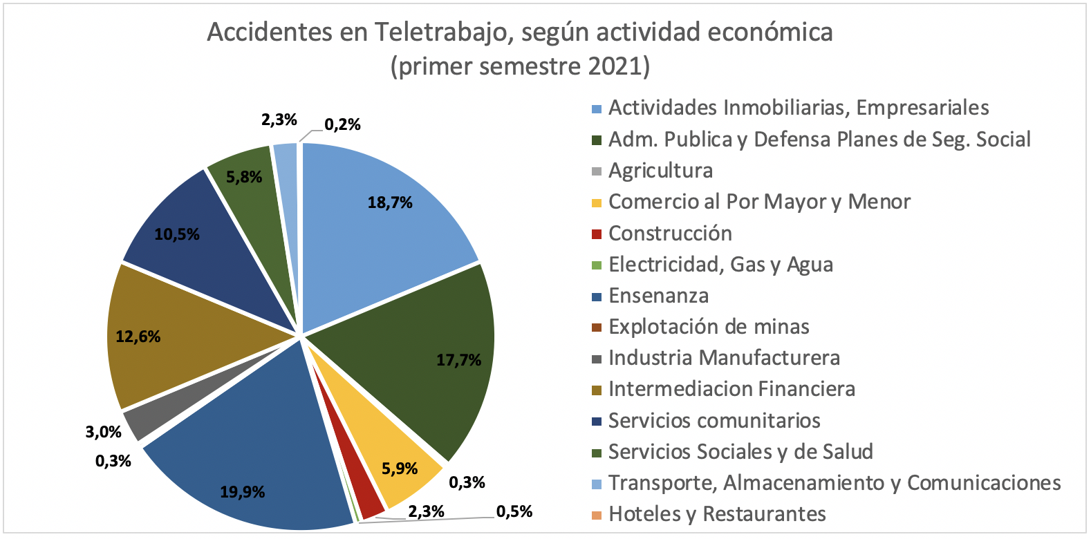 - Al igual que en 2020, en los sectores económicos con mayor proporción de casos reconocidos como de origen laboral son Enseñanza (20%), Actividades inmobiliarias y empresariales (19%) y Administración Pública (18%), sectores que han sido entre los más asociados a la realización de esta modalidad de trabajo.