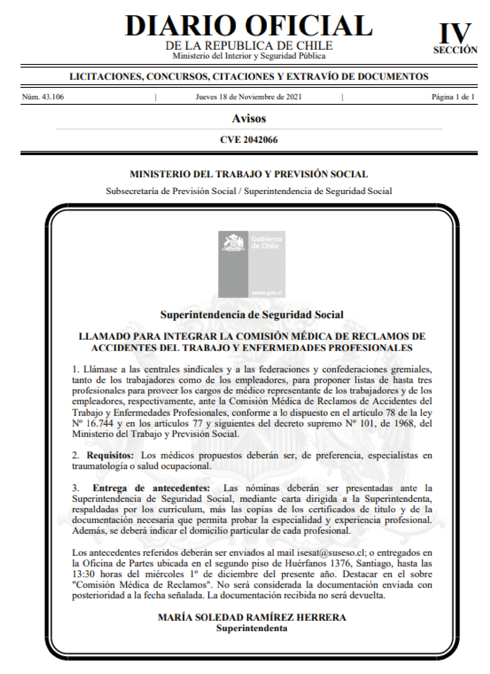 El 31 de diciembre de 2021 termina el período de nombramiento de los médicos integrantes de la Comisión Médica de Reclamos de la Ley 16.744. En este sentido, el Presidente de la República deberá nombrar en esta oportunidad a: