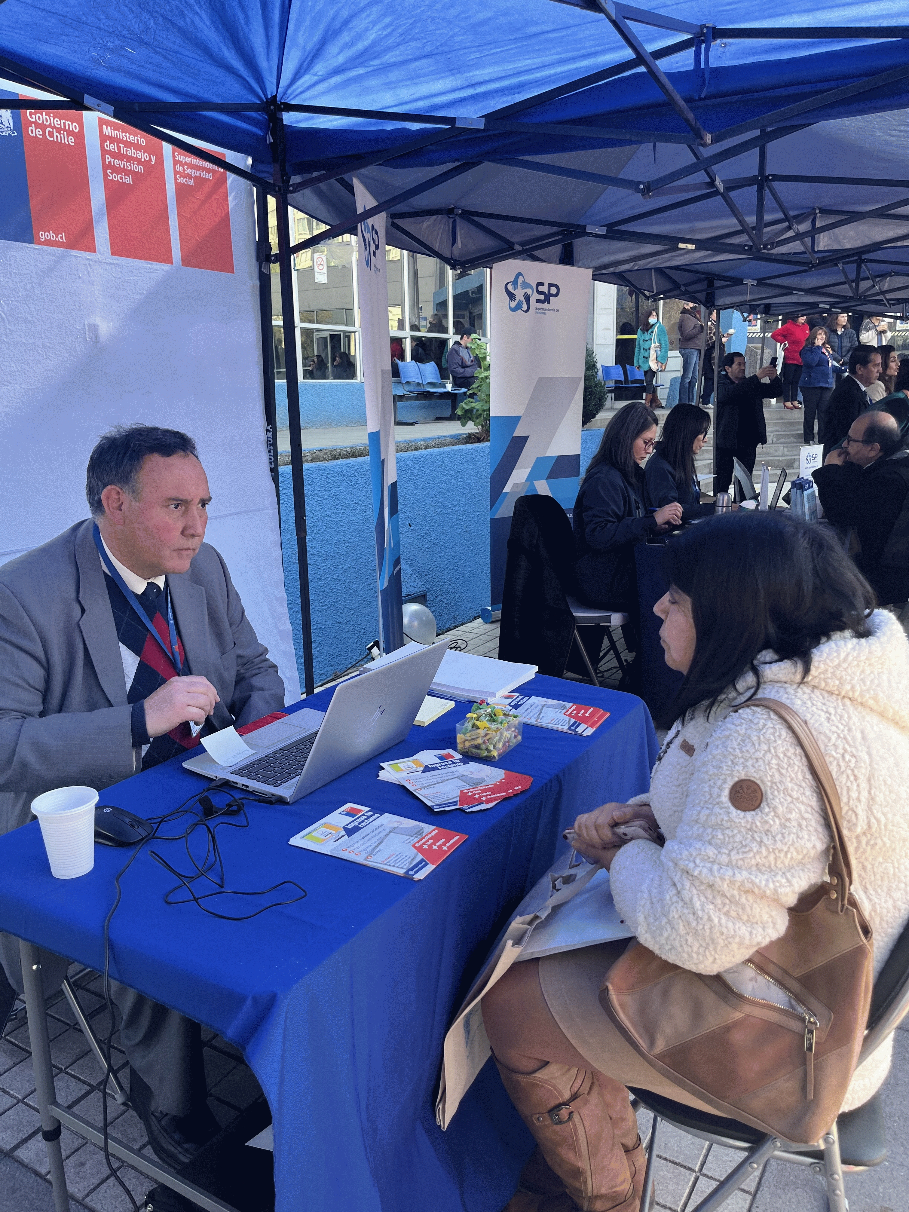 Concluido el conversatorio Mejores Pensiones para Chile, las y los vecinos participaron en una feria de servicios del Ministerio del Trabajo y Previsión Social donde estuvo presente la Superintendencia de Seguridad Social con un stand en el que los funcionarios entregaron información, resolvieron dudas e ingresaron trámites en línea de los asistentes.