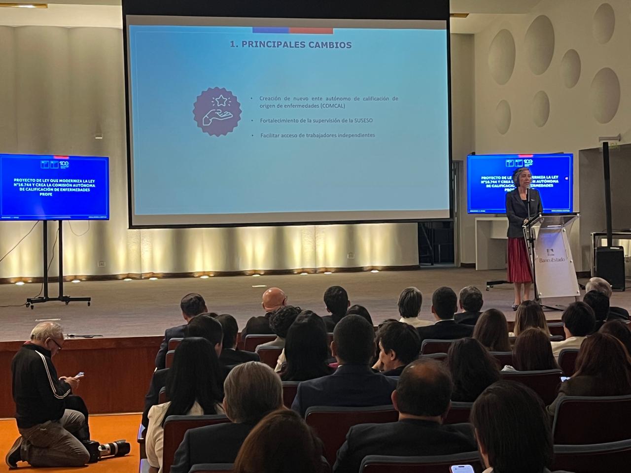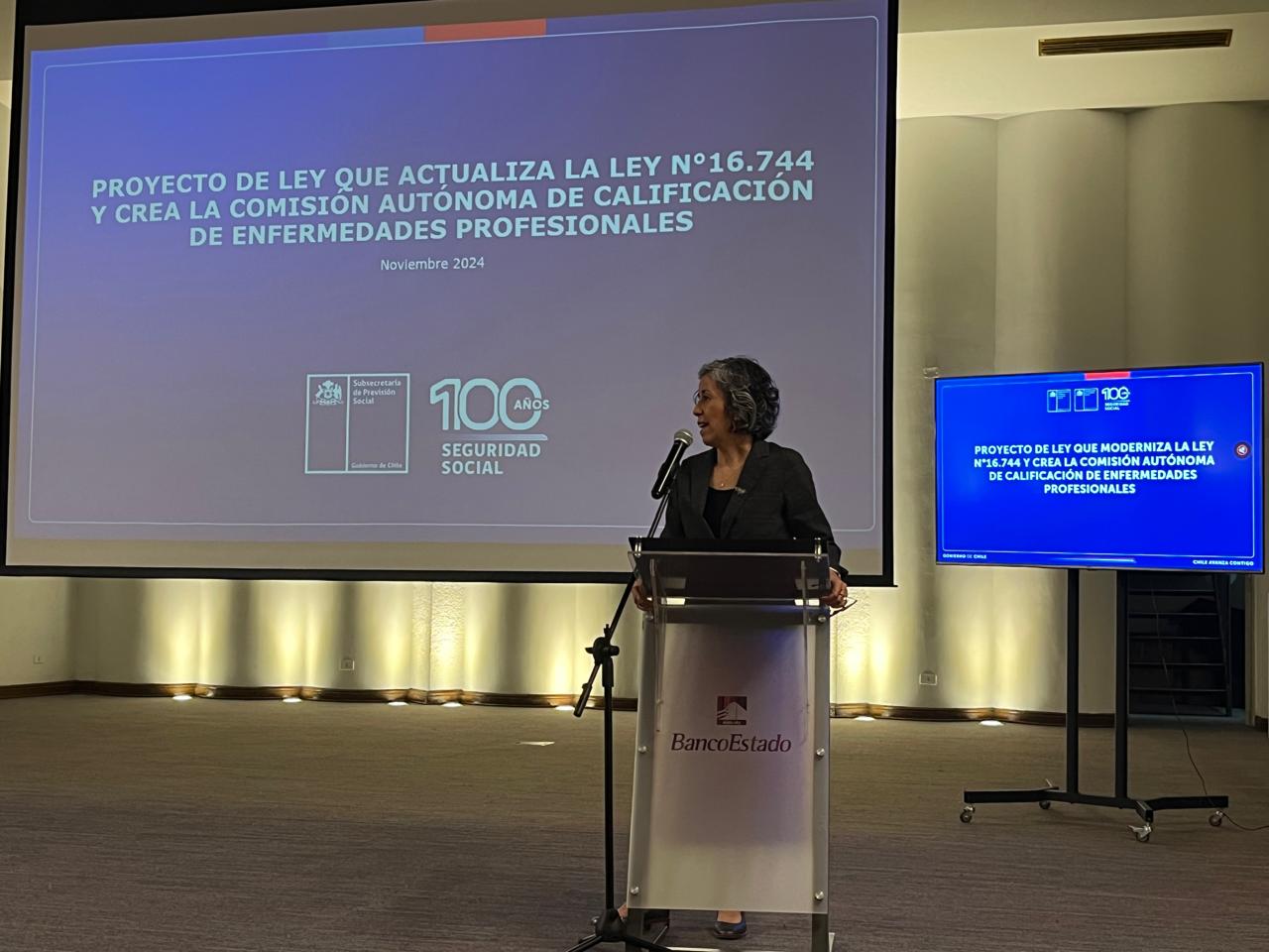 La secretaria de Estado explicó que la iniciativa tiene como uno de sus objetivos principales perfeccionar el sistema de calificación de las enfermedades profesionales, creando un nuevo sistema técnico que separe las labores que hoy se encuentran radicadas en los organismos administradores del Seguro de Accidentes del Trabajo y Enfermedades Profesionales (mutualidades de empleadores, que son la ACHS, IST y la Mutual de Seguridad, y el ente público Instituto de Seguridad Laboral, ISL) y las empresas con administración delegada.