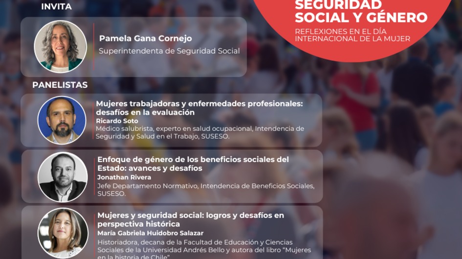 En el marco de la conmemoración del Día de la Mujer, la Superintendencia de Seguridad Social (SUSESO) realizó el webinar gratuito "Seguridad Social y Género. Reflexiones en el Día Internacional de la Mujer", una instancia con tres expositoras y expositores que abordaron temáticas de género y trabajo desde sus áreas de experiencias.