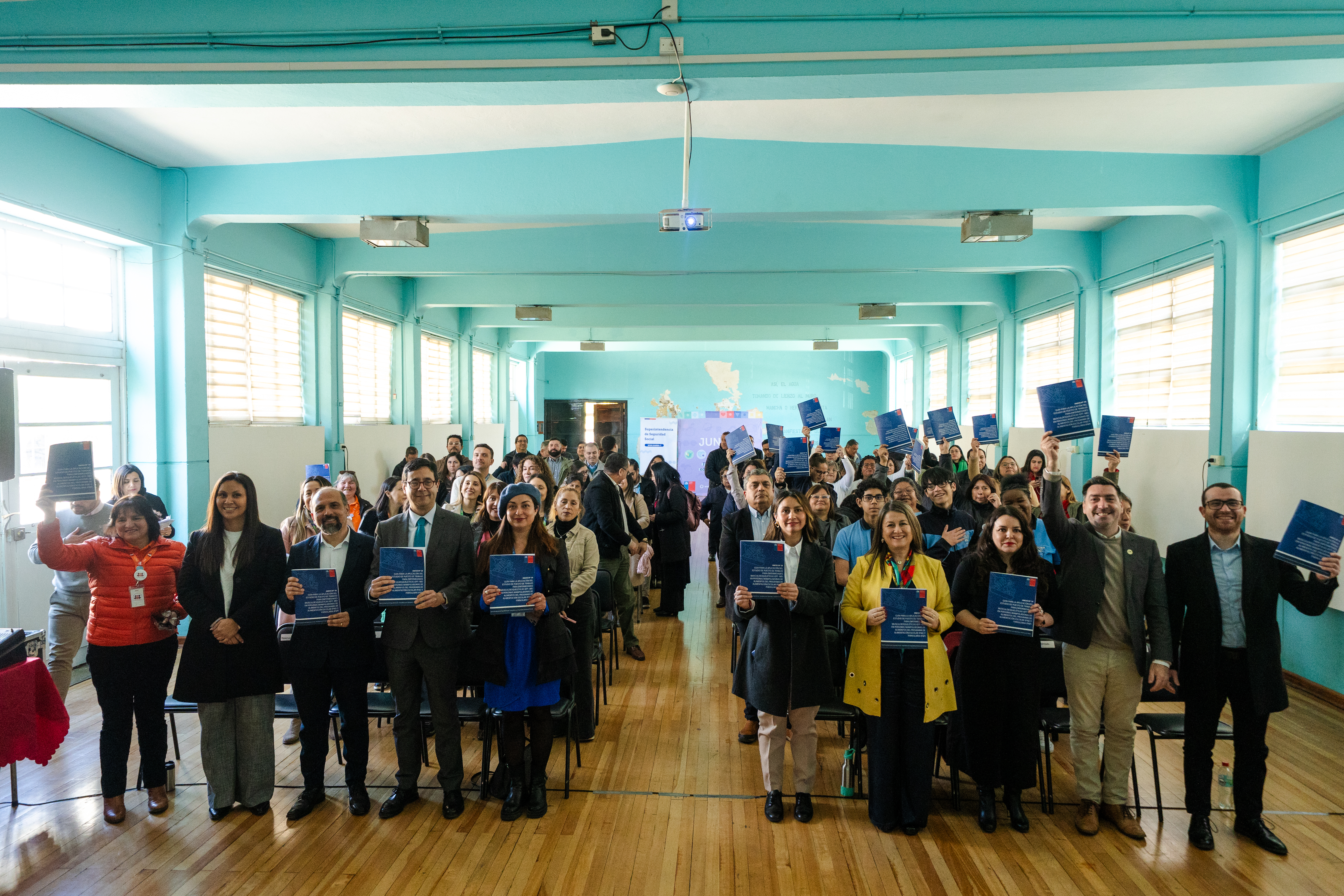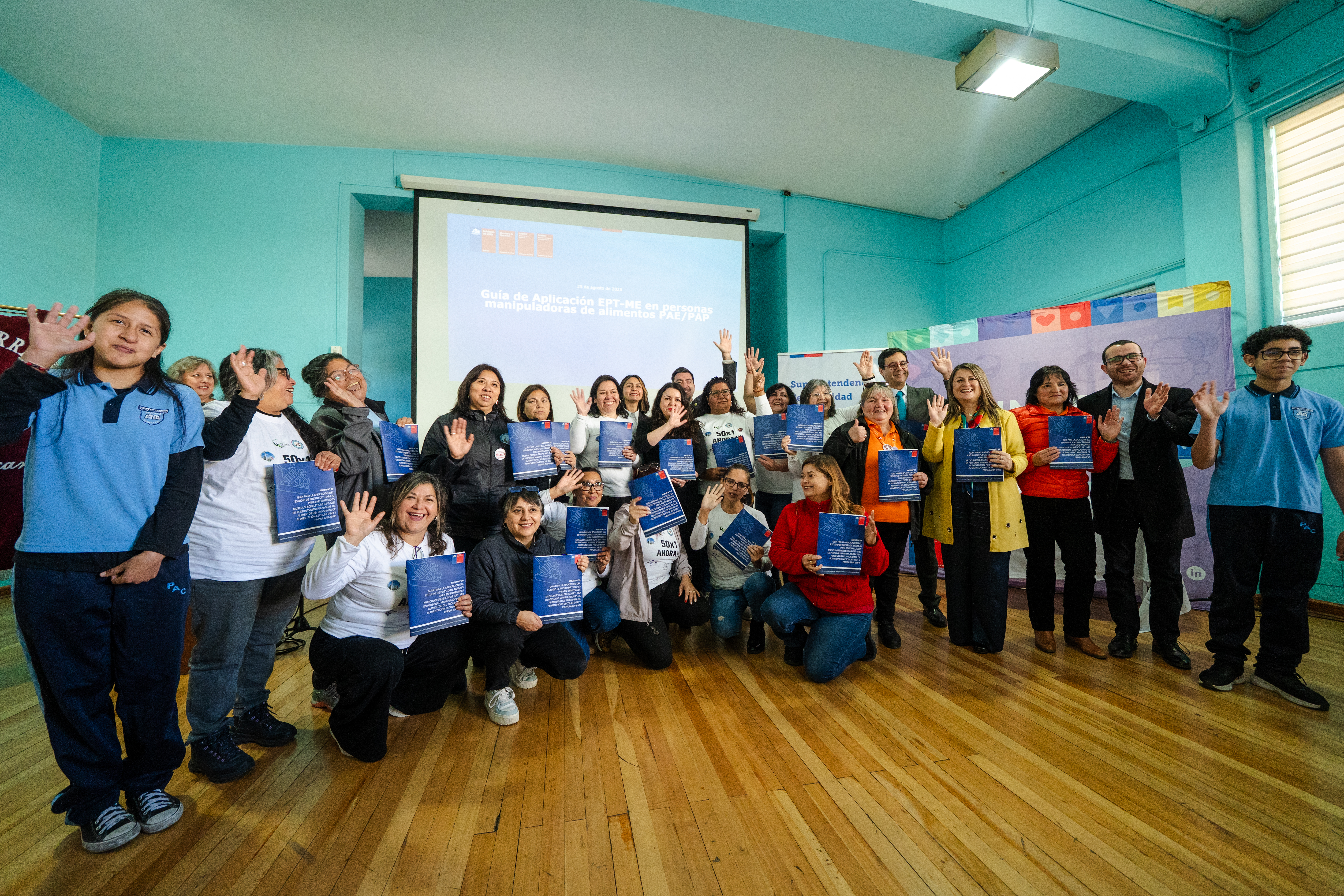 En la Escuela Básica Pedro Aguirre Cerda, en Cerrillos, la superintendenta (s) de Seguridad Social, Patricia Soto; y la directora de Junaeb, Camila Rubio, presentaron la primera guía para proteger la salud de más de 35 mil manipuladoras de alimentos del Programa de Alimentación Escolar y de Párvulos, con foco en detectar y prevenir enfermedades laborales.