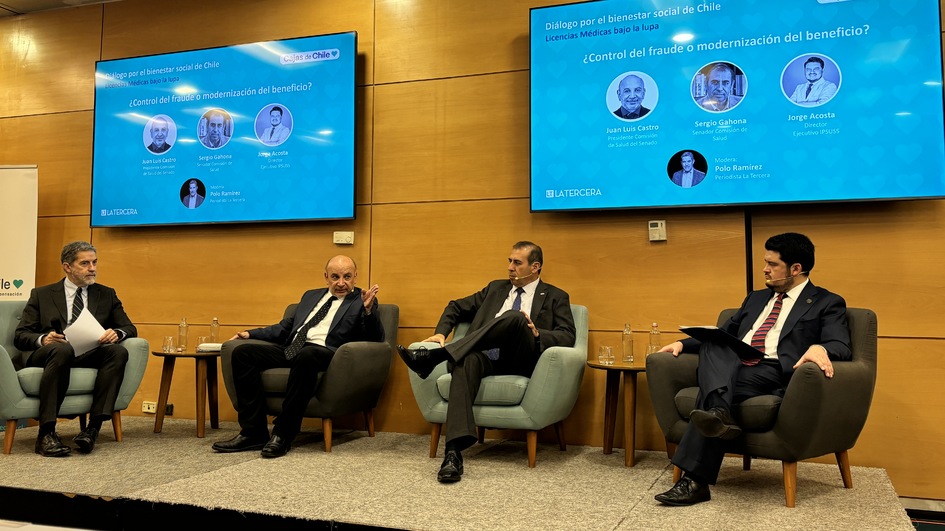 Tras la presentación, se desarrolló un panel de conversación en el que participaron el senador Juan Luis Castro, presidente de la Comisión de Salud del Senado; el senador Sergio Gahona, integrante de la misma comisión; y Jorge Acosta, director ejecutivo del Instituto de Políticas Públicas en Salud (IPSUSS), quienes intercambiaron visiones sobre los desafíos regulatorios, el cambio cultural respecto al sistema de licencias médicas en Chile y la importancia de fortalecer la confianza en el sistema.