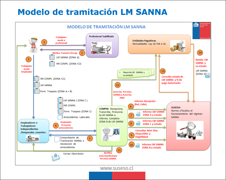 Paso 6 al 10: la COMPIN valida y recepciona los antecedentes entregados por el empleador (trabajador dependiente) o por trabajador independiente o temporal cesante. Entrega el COMPROBANTE DE TRAMITACIÓN SANNA (Anexo N°1 Circular N°3.364). Ingresa los antecedentes a su flujo interno donde podrá consultar el número de días autorizados a la SUSESO, además, en las etapas internas de su flujo de tramitación, deberá informar a la SUSESO 1) Recepción de Antecedentes, 2) ZONA A LM SANNA y su estado, 3) ZONA C de LM SANNA y su estado y 4) ZONA B de la LM SANNA y su estado.
