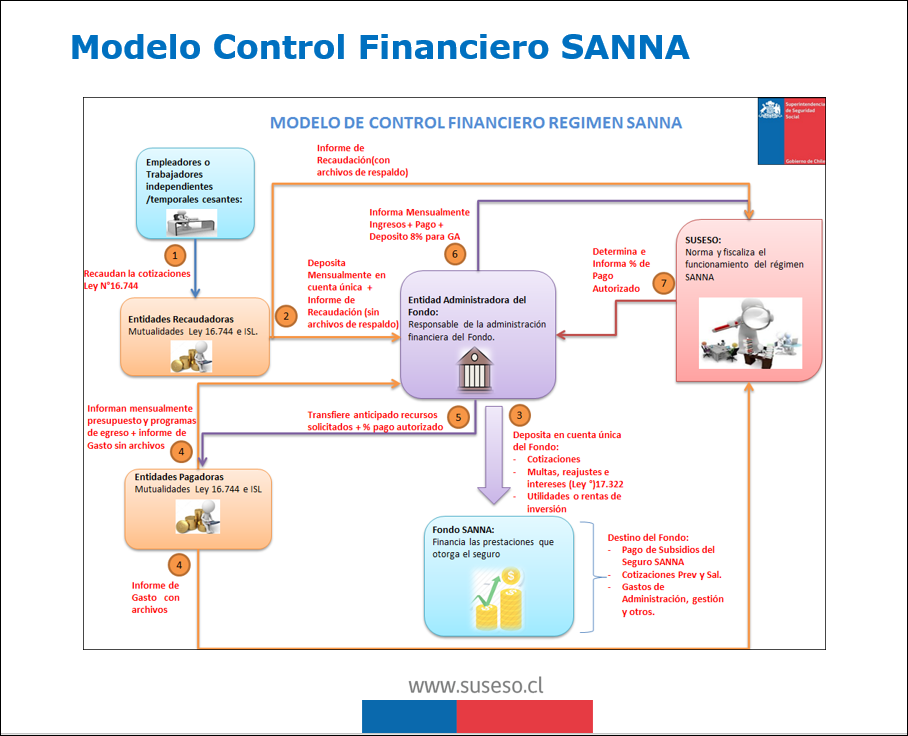 Paso 6: La Entidad Administradora informará a la SUSESO de manera mensual los Informes de Ingreso, Informes de Gasto (Informe Mensual de Movimientos, Anexo N°5 y Anexo N°7 Circular N° 3.633). Además deberá calcular el 8% sobre el monto de recaudación del mes al que corresponden las cotizaciones para el seguro SANNA, y transferir dicho monto a la Superintendencia de Seguridad Social (Anexo N°1 Circular N° 3.410). Hasta el término de la vigencia del artículo primero transitorio de la Ley N°21.063, este proceso deberá ser efectuado por las Entidades Recaudadoras.