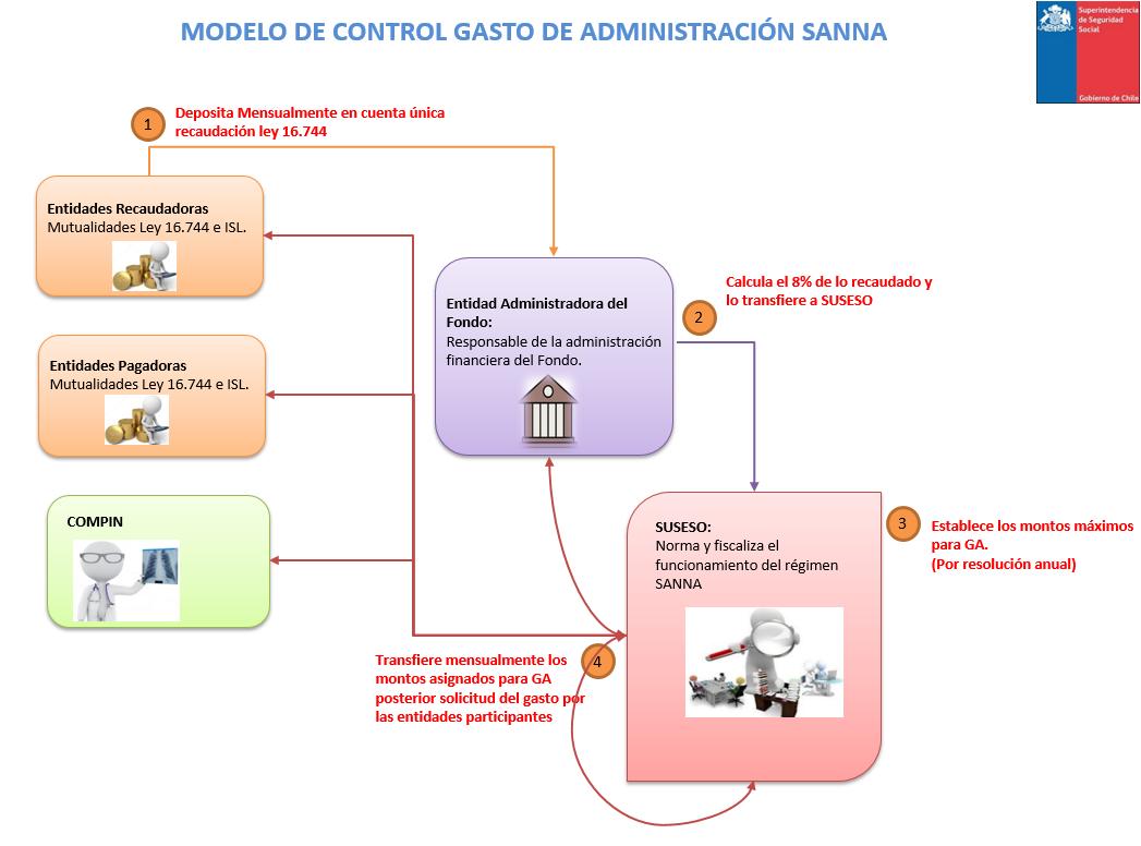 A continuación, se ilustra el modelo operativo del control del gasto de administración del Seguro SANNA (Circular N° 3.410), el cual considera la participación de los siguientes actores y flujo de documentos e interacción entre entidades participantes:
