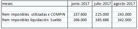 Que, de acuerdo con las liquidaciones de sueldos tenidas a la vista la interesada percibió remuneraciones imponibles por montos superiores a los considerados por la COMPIN para determinar el subsidio prenatal. En efecto, para realizar el primer cálculo de acuerdo con el inciso primero del articulo 8° del DFL N° 44, de 1978, del MTYPS, se deben considerar los meses de junio, julio y agosto de 2017, a continuación se adjunta cuadro donde se observan las diferencias: