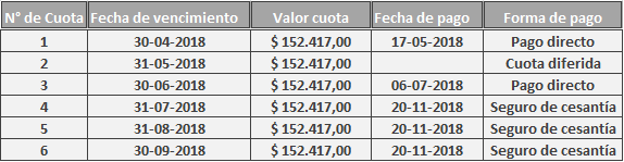 Manifestó que las cuotas N° 1 a la N° 6 de un total de 23, correspondientes a los meses de abril a septiembre de 2018, fueron pagadas según el siguiente detalle: