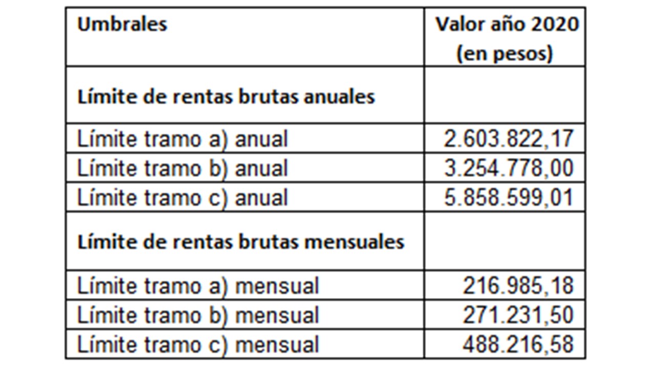 Considerando el porcentaje de reajuste antes indicado, los tramos de renta bruta de los artículos 3º y 4º de la Ley Nº20.338, deben alcanzar los siguientes valores para el año 2020: