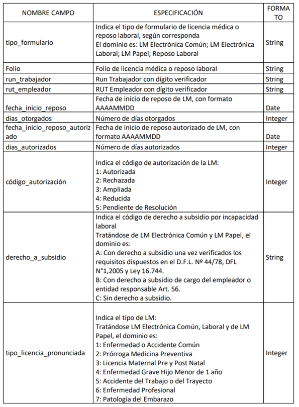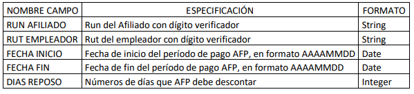 Descripción del archivo: La Superintendencia de Seguridad Social, remitirá los días de reposo que la AFP deberá descontar respecto de todas las licencias médicas de origen común, maternal, y licencias o reposos de origen laboral que posean los RUNAFILIADO para los respectivos RUT Empleadores, informados en el Anexo N°1, en base al mecanismo de transmisión indicados en el texto de este oficio.