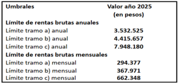 Considerando el porcentaje de reajuste indicado en la letra a) anterior, los tramos de renta bruta de los artículos 3° y 4° de la Ley N°20.338, quedan fijados por los siguientes montos para el año 2025:
