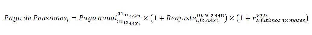 Pago de Pensiones i : Corresponde al monto total de las pensiones pagadas durante el año a los distintos tipos de pensionados (invalidez, viudez u orfandad) por los que se tenía constituida una reserva al inicio del año. Cabe señalar, que los respectivos pagos deberán ser por el total de los beneficios pagados, no tan sólo por aquéllos por los cuales se tuvo previamente constituida la reserva, esto es, pensión base, más el total de los incrementos y más, el total de las bonificaciones pagadas. Además, estos pagos deberán ser actualizados por la variación del IPC definida, según el D.L. N°2.448, de 1978, así como también por la tasa de interés técnico vigente en el mercado, la cual publica mensualmente en su sitio web, la Comisión para el Mercado Financiero de Chile (CMF).