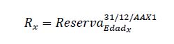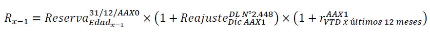 Por ejemplo, para el año AAX1 y un tipo de pensionados determinado (invalidez, viudez u orfandad) el numerador del indicador se calculará como la liberación de reservas que se reconoce en el periodo comprendido entre el 01.01.AAX1 y el 31.12.AAX1, respecto del colectivo de pensionados por los que se tenía reserva al inicio del periodo, es decir al 01.01.AAXX. Dicha liberación corresponde a la diferencia entre el valor de la reserva al inicio del período (R x-1) y el valor de la reserva al final del período (R x), debiéndose actualizar la reserva de inicio (R x-1), tanto por el reajuste que se hace por IPC a las pensiones en el mes de diciembre del año AAX1 (según lo establecido en el D.L. N°2.448 del Ministerio de Hacienda), como también por la tasa de interés técnico vigente en el mercado. Dicha tasa de interés corresponde a la tasa equivalente promedio de los últimos 12 meses que se obtiene a partir del Vector de Tasas de Descuento (VTD), para valorizar pasivos de seguros que publica mensualmente, en su sitio web, la Comisión para el Mercado Financiero de Chile, es decir:
