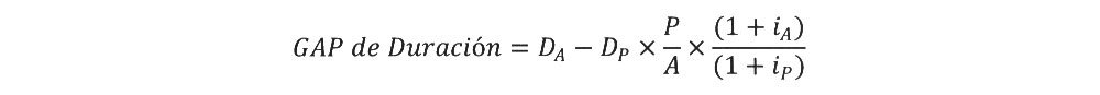 Una vez obtenidas las duraciones de los activos y pasivos afectos a riesgo de tasa de interés, se debe determinar el descalce de activos y pasivos de la mutualidad, a través del cálculo del GAP de Duración, el cual no sólo considera el descalce en plazo, sino también los montos registrados de activos y pasivos sensibles a riesgo de tasas de interés. El GAP de Duración se obtiene de la siguiente forma:
