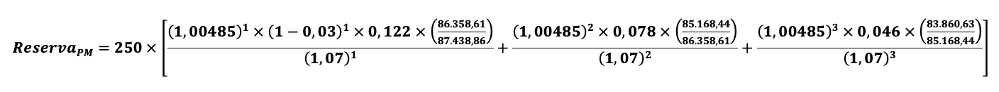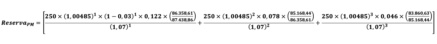 Sea el caso de un expuesto, trabajador, que al 31/12/2020 tiene 67 años y 0 mes, de sexo masculino, no inválido, quien está en su séptimo año de tratamiento médico. De acuerdo a la expectativa de su alta médica, aún le quedan 3 años de tratamiento por cumplir. En este caso, las probabilidades de supervivencia se obtienen de la tabla de mortalidad CB-2014. Asimismo, se sabe que el monto total base de gasto por prestaciones médicas incurrido en este expuesto durante los primeros 12 meses, desde la fecha de emisión de su DIAT, asciende a 250 UF, y que durante los próximos 3 años de tratamiento, el gasto en salud crecerá anualmente 0,485% por sobre el índice de precios al consumidor (el IPC anual de salud esperado es igual a 3,5%, mientras que el IPC anual esperado es igual a 3%). Por último, se ha estimado que sólo por el próximo año habrá un ahorro en el gasto en prestaciones médicas igual al 3%, y que la tasa real anual de costo de capital corresponderá al 7%. Por lo tanto, la reserva por prestaciones médicas se calculará teniendo en consideración los siguientes factores: